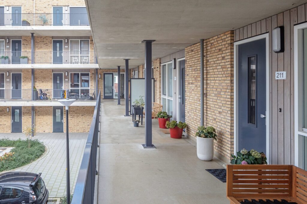 De gevels kennen – evenals de eerder gerealiseerde Hof- en Laanwoningen – een rijke detaillering met diverse betonnen en houten sierelementen. Aan de achterzijde van het gebouw kan geparkeerd worden en bevinden zich galerijen die toegang geven tot de woningen. De woningen zonder balkon hebben op de galerij een eigen buitenruimte met avondzon en bieden gelegenheid tot ontmoeting en sociaal contact.