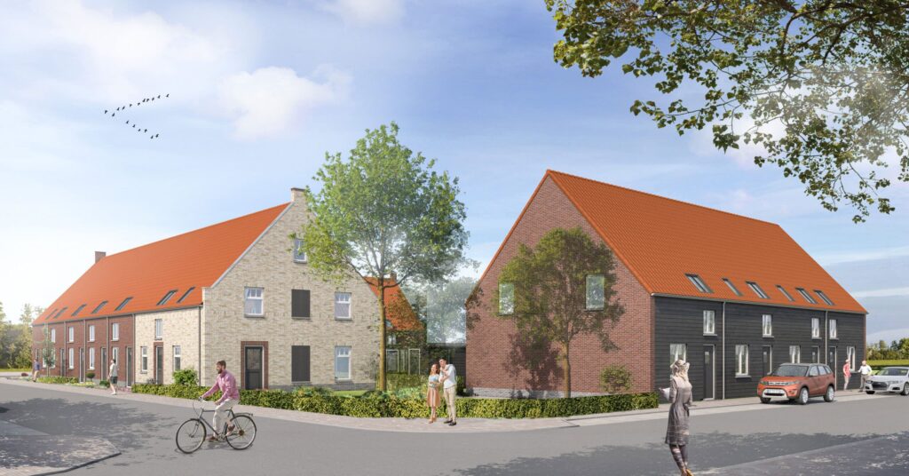 Dit nieuwbouwproject omvat 14 grondgebonden gezinswoningen met een landelijke uitstraling. Het ontwerp is geïnspireerd op een traditionele boerderij met bijbehorende schuren. Deze sfeer komt tot uiting in de toepassing van houten gevels bij vier woningen en de afwisseling in gevelkleuren, waarmee een hoofd- en bijgebouw worden gesuggereerd.